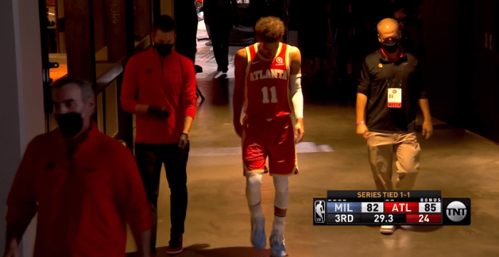 下半场,特雷-杨第三节又再次开启得分模式,外线连续命中两记三分,突破2+1点燃全场,此节后半段连续造犯规罚球得分,全场球迷高呼MVP,单节独砍15分又杀疯了,不过杨踩到边线裁判的脚导致脚踝扭伤,一瘸一拐返回更衣室,末节重返赛场。