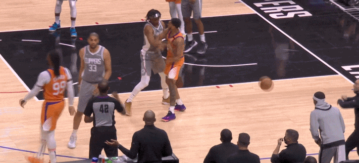 激烈的比赛也场场上火药味爆发,首先是保罗乔治和布克这边,在进攻端,生孩子的BUFF似乎消失了,乔治强打布克打铁,随后乔治或许是不满意布克的防守动作,怒推布克,吃到了一个技术犯规。随后,太阳队的佩恩也因为不满意曼恩的防守动作,上演了怒推对手的一幕,这也让双方的火药味持续加重。