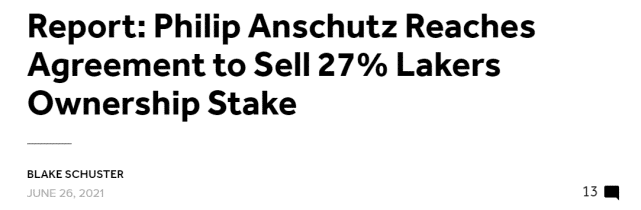 来源:直播车06-26 14:49直播车讯 北京时间6月26日,据美媒报道,81岁亿万富翁菲利普-安舒茨已经和匿名买家达成协议,出售他所拥有的湖人27%的股份。目前,这一协议还没有通过NBA董事会的正式审批。