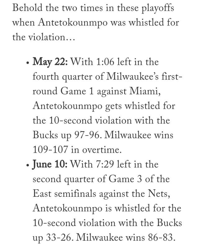 一次是当地时间5月22日,雄鹿对阵热火系列赛的第一场,第四节还剩1分6秒时,字母哥被吹了一次罚球10秒违例,最终,雄鹿109-107加时击败热火。另一次是当地时间6月10日,雄鹿对阵篮网系列赛的第三场,第二节还剩7分29秒时,字母哥被吹了一次罚球10秒违例,最终,雄鹿86-83赢下那场比赛。