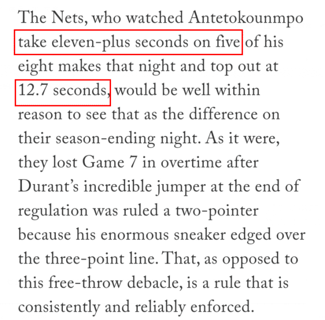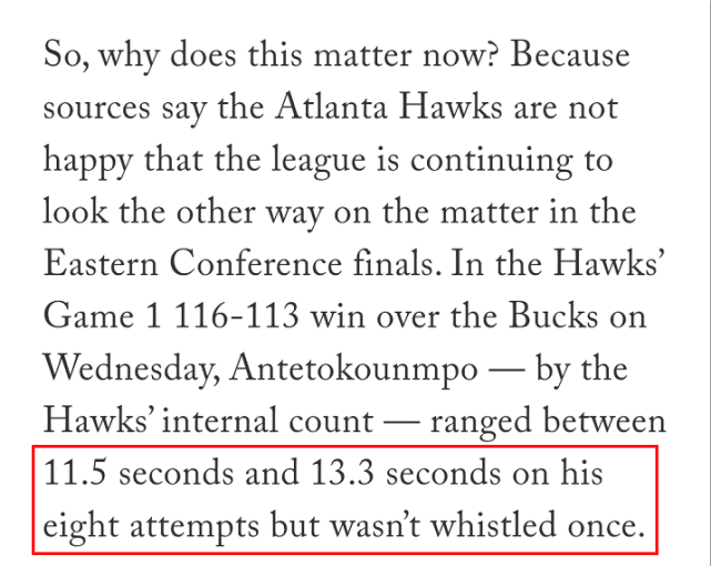 阿米克报道称,老鹰队有专门的数据统计人员,对字母哥在东决G1的8次罚球进行用时统计,结果他所用的时间在11.5秒至13.3秒之间,但当值裁判没有吹罚其中任何一个10秒违例。