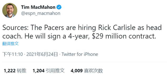 来源:直播车06-25 15:31直播车讯北京时间6月24日,来自名记蒂姆·麦克马洪的报道,步行者将聘请前独行侠主帅卡莱尔,担任球队新的主教练。双方将签订一份为期4年,总价2900万美元的合同。卡莱尔曾在2003年到2007年执教步行者,并一度率队打出61胜21负的骄人战绩。此番再续前缘,步行者显然希望卡莱尔率队迎来突破!