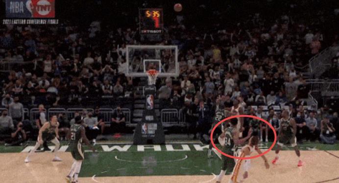 无法防守的情况下,如何解决特雷杨,在第四节比赛还剩下5分34秒的时候,字母哥又来了,而且这次是手脚并用。