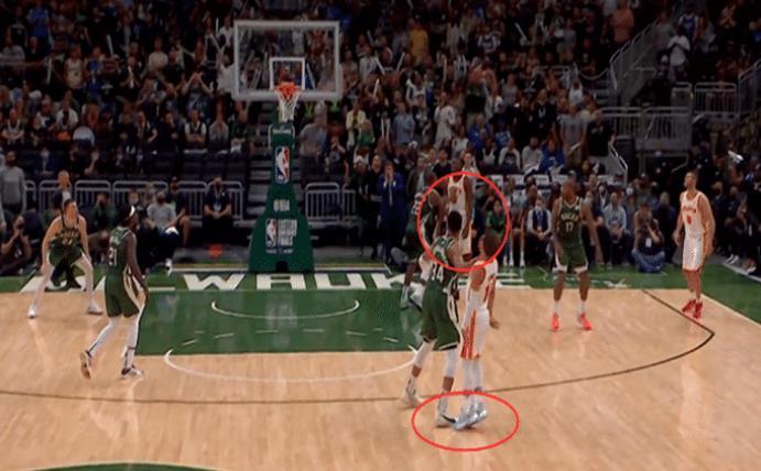 面对字母哥的防守,特雷杨干拔投篮,只见字母哥这时候习惯性地伸出右脚,他的脚掌放的位置就是特雷杨圆柱体下面,也就是特雷杨的脚下。