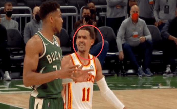 当然这还不是全部,除了脚上的动作,字母哥手上还有一个跟随的动作,打到了特雷杨的脸上。