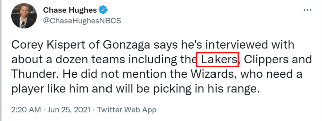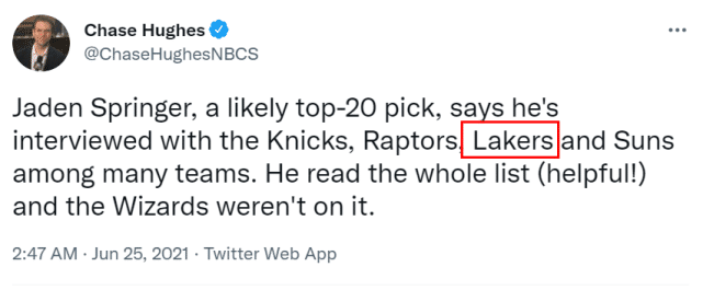 在NBADRAFT网站的预测顺位上,他排在首轮第13位,是有望进入乐透区的新秀。他面试了不少球队,其中包括湖人、快船和雷霆。湖人要想选择他,只能指望他最终顺位下滑。