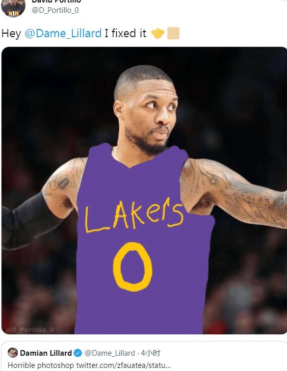球迷们的P图得到了本尊的回应,一时间点燃了球迷们的热情,很快就有湖人球迷也如法炮制,不过他的技术就要差很多了,只是把爵士的蓝色球衣颜色换成了紫色,还有金色的湖人和0号的字样。这名湖人球迷配文:“嘿,利拉德,我修复了它![握手]”