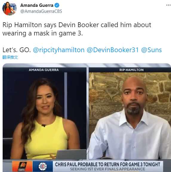 汉密尔顿透露之后,名记Rachel Nichols报道,布克将会佩戴面具登场从而来保护他的鼻子,赛前投篮训练时,布克戴着面具,没有感到任何不适。