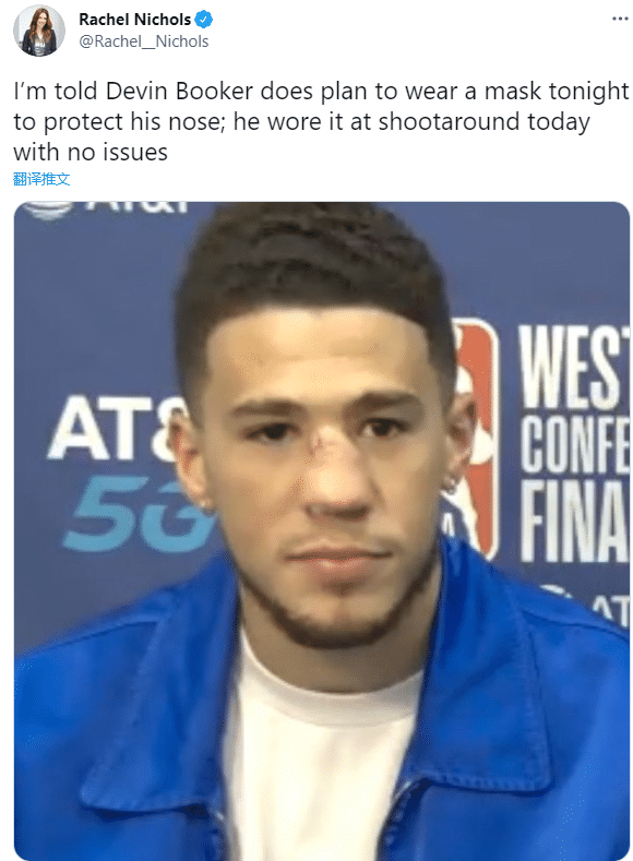 西决第二场,布克在进攻时与贝弗利相撞,鼻子被撞得血流不止,缝针后重返赛场,最终太阳再次拿下胜利;不过布克的鼻子早已肿的不成样子,而且鼻子被撞歪了;为了保护受伤的鼻子,因此布克将会戴面具出战西决G3,在洛杉矶斯台普斯球馆,布克戴面具出战,如此画面不禁让人想起科比。