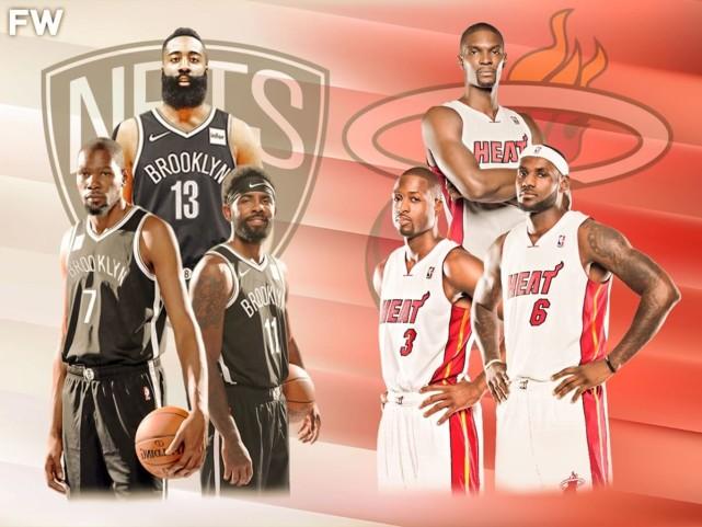 对比一下生涯数据吧。热火三巨头:詹姆斯场均27分7.4篮板7.4助攻,韦德场均22分4.7篮板5.4助攻,波什场均19.2分8.5篮板2助攻。篮网三巨头:杜兰特场均27分7.1篮板4.2助攻,哈登场均25.1分5.5篮板6.5助攻,欧文场均22.8分3.8篮板5.7助攻。