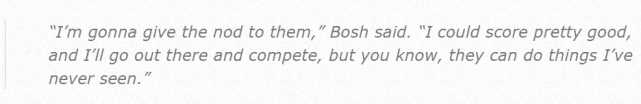 波什说:“我认为将是他们。我也能得分,也能去竞争,但你知道的,他们能做到我从未见过的事。”波什认为篮网三巨头的突破和投篮能力都是顶级的。“在一场3v3的比赛中,这些家伙能命中所有的投篮,我的意思是他们三个人都有这样的能力,这看上去很不公平。”波什调侃自己要去防守杜兰特,看上去他没有信心能阻挡这位超级得分手。“我做不到,哈哈哈!”波什笑着说道。