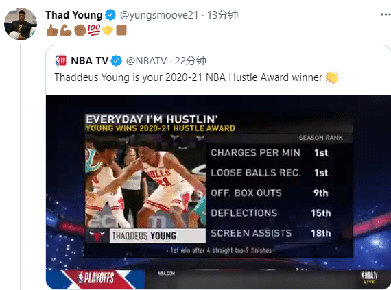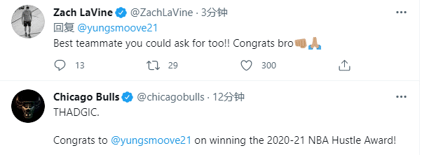 公牛官方第一时间恭喜赛迪斯-杨获得NBA最佳拼搏奖,晒出杨拼命防守的画面;公牛球星扎克-拉文也恭喜队友,直言:恭喜兄弟,最好的队友。