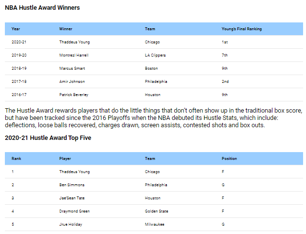 此前几届最佳拼搏奖的获奖者分别是哈雷尔(19-20)、斯玛特(18-19)、阿米尔-约翰逊(17-18)和贝弗利(16-17);如今33岁赛迪斯-杨荣获此项大奖,实至名归!