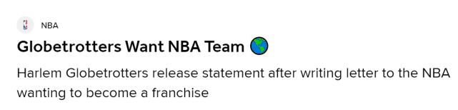 “基于我们已经证明的一切,我们完全可以派出一支和当今职业球员相媲美的天才球队。我们希望有机会做到这一点,作为一支世界知名和传奇的篮球队,我们提出加入NBA的请求!”哈林篮球队的高管表示。