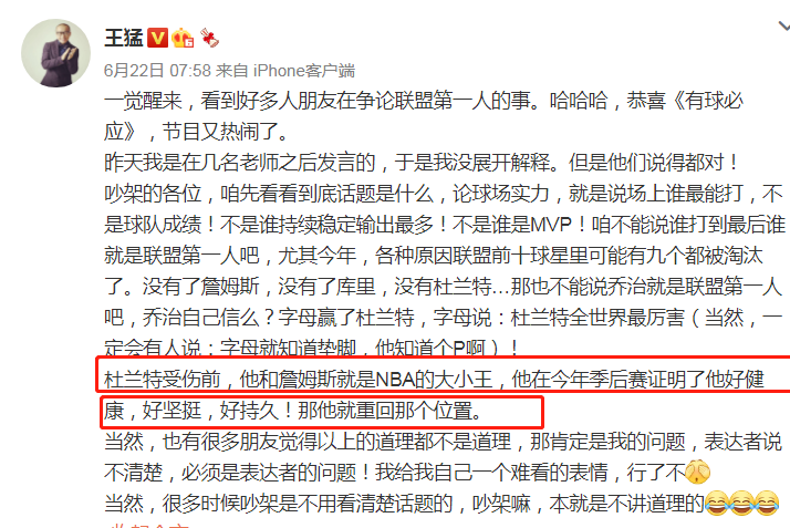 王猛老师则非常直接,他在社媒上发长文谈到了联盟第一人之争,在王猛看来,詹姆斯和杜兰特是联盟大小王,当KD恢复健康归来之后,他重回到那个位置(小王)。可见,王猛还是认为,詹姆斯是NBA大王,也就是联盟第一人,杜兰特只能是小王。