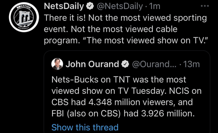 这其中篮网和湖人等队的出局对于联盟是有影响的,这其中从收视率来看,篮网被淘汰让联盟损失了本赛季收视率最强担当,值得一提的是在篮网和雄鹿的天王山之战,创造了本赛季季后赛最高的收视率纪录,全网收视率为570万人。如果按照一整个赛季来看,也仅仅比勇士湖人的季后赛第一场780万、勇士附加赛第二战灰熊717万要少一些,排名赛季第三。