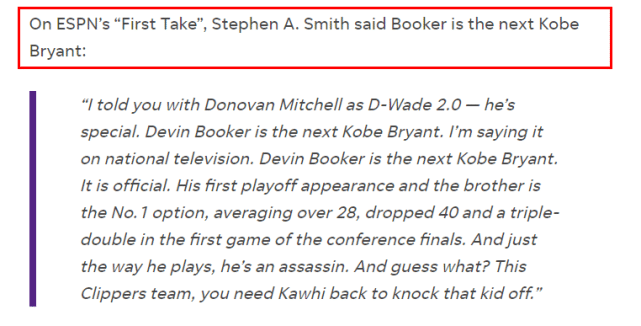 “我对你们说过,多诺万-米切尔就是韦德2.0,他很特别。德文-布克就是下一个科比-布莱恩特。我在国家电视台上说的,德文-布克就是下一个科比-布莱恩特……他在第一次季后赛之旅里成为了球队的头号得分选择,场均超过28分,在生涯首场分区决赛就轰下40+三双。就他打球的方式而言,他就是一个刺客。你猜怎么着?这支快船队,你们需要科怀(莱昂纳德)回归才有希望击败这个孩子。”