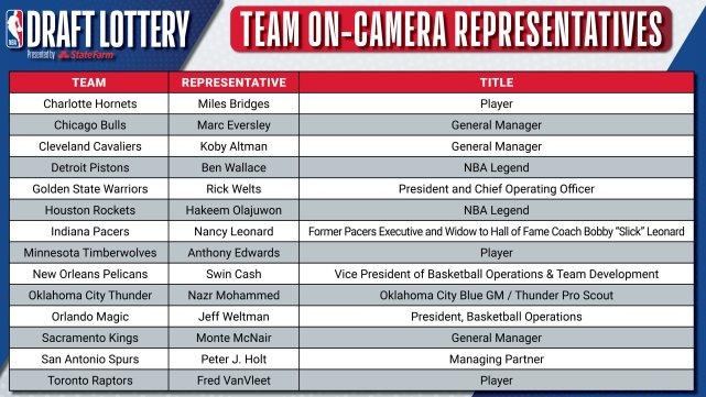 来源:直播车06-22 11:32直播车讯 北京时间6月22日,NBA官方公布了14支NBA球队的乐透抽签代表名单,而明天,NBA将进行乐透抽签仪式。具体的代表名单如下——