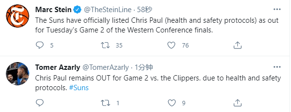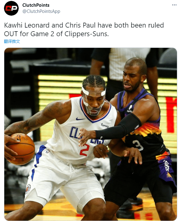 来源:直播车06-22 11:17直播车讯 北京时间6月22日,快船和太阳西决G2伤病报告出炉,快船队小卡、伊巴卡缺席比赛,小莫里斯出战成疑;太阳队克里斯-保罗仍旧处于隔离中,继续缺战西决第二战;两队都已官宣,西决G2仍旧是乔治大战布克,小卡和保罗两大领袖都缺战。