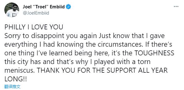 而他之后发推更是充满了不满“费城,我爱你们。很抱歉再次让你们失望了,希望了解情况的你们要知道,我已经倾尽了全力。我在这里明白的唯一的事情就是,这座城市是强硬的,这也是为什么我会选择带着半月板撕裂的伤继续上场。谢谢你们一整年的鼎力支持”是啊,他带伤拼尽全力了无怨无悔,至于怪谁大家都知道!