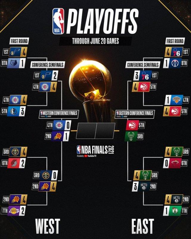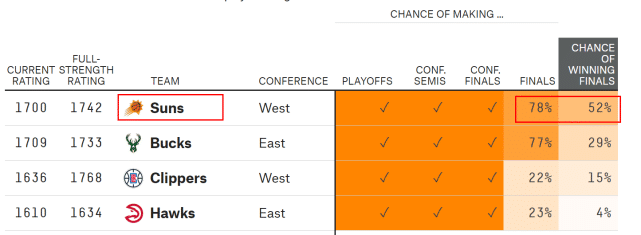 来源:直播车06-21 15:42直播车讯 北京时间6月21日,太阳120-114主场击败快船,拿下西决首胜。布克40分13篮板11助攻,拿下生涯第一次三双。老鹰103-96击败费城,和雄鹿会师东部决赛。赛后数据网站FiveThirtyEight第一时间更新了夺冠概率。太阳成为最被看好的球队。