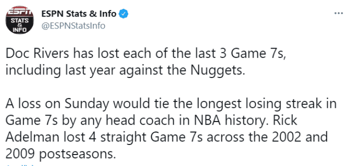 来源:直播车06-21 10:31直播车讯 北京时间6月21日,NBA东部半决赛费城和老鹰迎来最后的抢七。赛前,ESPN统计了一项数据,让费城主帅里弗斯比较尴尬。根据统计,里弗斯在过往3个抢七中全部败北。而一旦这场继续输球,他将追平NBA历史上抢七最长的4连败,而之前保持这一纪录的是阿德尔曼。