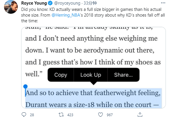 赛后ESPN记者罗伊斯-杨进行报道,他点评到了最后时刻杜兰特投出的是两分球而不是三分,称:“你们知道吗?杜兰特场上穿的球鞋码数比他真正的鞋码数要大整整一码,这也是他为什么总是掉鞋的原因 ”