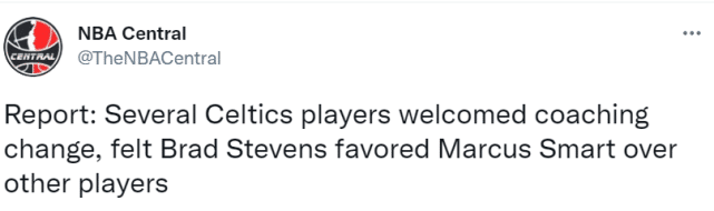 来源:直播车06-20 10:43直播车讯 北京时间6月20日,The Athletic名记Jared Weiss撰写长文,揭秘凯尔特人目前糟糕的球队氛围。报道称,凯尔特人队内的多位球员对于球队换帅表示欢迎。消息人士透露,他们抱怨史蒂文斯没让关键球员承担责任,还偏爱斯马特。