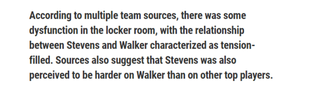 凯尔特人选择送走沃克,一方面是史蒂文斯升任篮球运营总裁后的决定,另一方面在于高层对沃克的长期健康没有信心。本赛季,沃克因伤只打了43场常规赛。