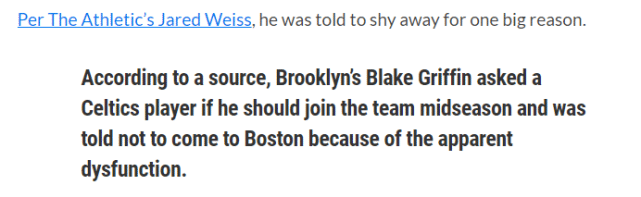 Jared Weiss还在报道中透露了一个有趣的细节。格里芬在加盟篮网前,曾经向绿军球员咨询是否应该加盟凯尔特人,得到了否定的答案。一位绿军球员告诉格里芬不要来波士顿,因为这里的更衣室有明显的问题。最终,格里芬选择加盟篮网,和三巨头成为队友。
