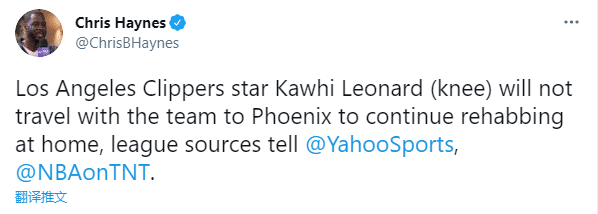 来源:直播车06-20 10:26直播车讯 北京时间6月20日,快船巨星莱昂纳德最新伤情出炉,据名记海耶斯报道,小卡因膝盖不会随队前往菲尼克斯,继续留在洛杉矶接受治疗,这意味着小卡继续伤停,因伤缺席西决G1。