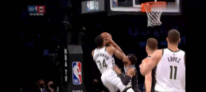 字母哥强行突破格里芬,面对协防的布朗,眼看到字母哥已经起跳无法阻止,失去位置的布朗选择了犯规。因为字母哥冲击力道太快,布朗有保护性地抱住了字母哥,一来防止字母哥受伤,二来也避免字母哥打成2+1.