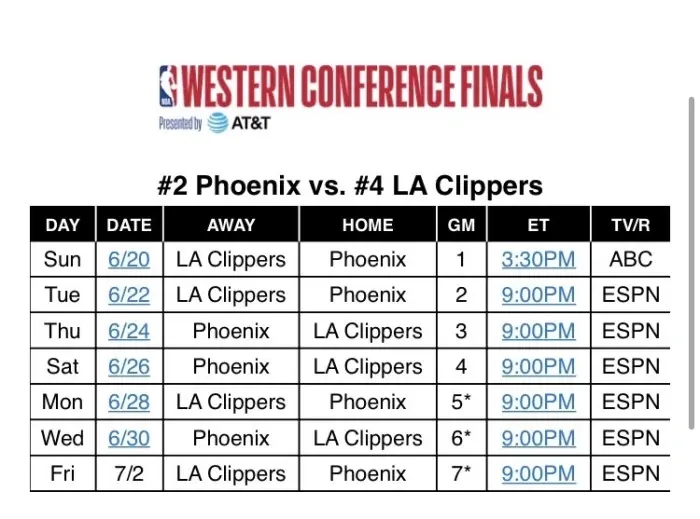 来源:直播车06-19 14:39直播车讯 快船没有等到抢七,最终在今天完成25分的大逆转解决了战斗送对手回家,现在西决的日程表已经出炉了,他们将会在两天后与太阳上演西决G1!