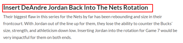 到目前为止,篮网在这轮系列赛里最大的缺陷是篮板能力和前场的身高问题。由于小乔丹不在轮换中,他们失去了在低位抵抗雄鹿的体型、力量和运动能力。把小乔丹放回轮换,将在抢七大战的攻防两端产生重要影响。