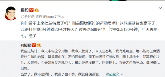 抢七,还是很有悬念的对决,杜兰特回到主场还是要承担更多,哈登的状态在恢复,不过这场比赛只是第二节打得不错,后两节还是比较低迷,也出现了多次失误。此外,杨毅也指出,篮网虽然末节追到了只差5分,但也是强弩之末,先输和后输没什么区别。