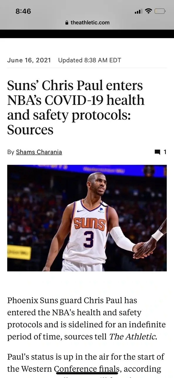 来源:直播车06-17 11:25直播车讯 北京时间6月16日,名记Shams突然爆料爆炸性新闻,太阳核心控卫克里斯保罗因为触发了联盟健康与安全协议,将会无限期缺阵!