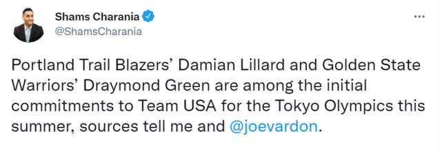 来源:直播车06-16 14:57直播车讯北京时间6月16日,据The Athletic报道,开拓者球员利拉德和勇士球员德雷蒙德-格林都已经对美国男篮做出初步承诺,他们愿意随队参加今年夏天的东京奥运会。