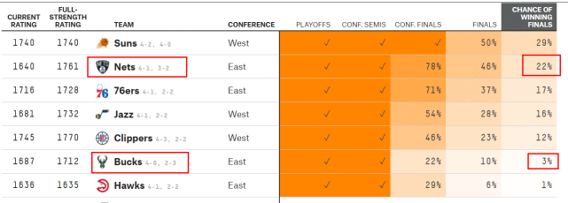 来源:直播车06-16 14:54直播车讯北京时间6月16日,篮网114-108击败雄鹿,拿下天王山之战的胜利。杜兰特打满48分钟,轰下49分17篮板10助攻3抢断2盖帽,6项数据都是全队第一。赛后,数据网站FiveThirtyEight第一时间更新夺冠概率,杜兰特的爆发,让篮网曙光再现,他们的夺冠概率从G5前的第四升至第二。