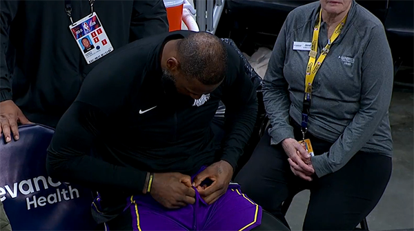 下半场,詹姆斯第三节2投2中拿到6分,可湖人不仅打得被动,而且单节23-32又输9分,三节打完湖人已经落后14分;末节詹姆斯和浓眉继续带队抵抗,无奈分差越来越大,比赛还剩2分09秒,湖人提前认输,詹眉坐在替补席十分沮丧,比赛还没结束,詹姆斯提前离场。