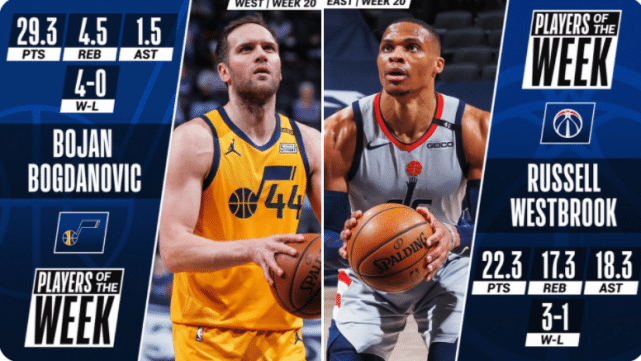 来源:直播车05-11 10:29直播车讯 北京时间5月11日,NBA官方宣布了上周的周最佳球员。东部周最佳属于奇才后卫拉塞尔-韦斯布鲁克,西部周最佳则由爵士前锋博扬-博格达诺维奇当选。