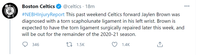 来源:直播车05-11 10:25直播车讯 北京时间5月11日,凯尔特人官方宣布,前锋杰伦-布朗被诊断出左手腕舟月韧带撕裂,预计将在本周晚些时候接受手术治疗,已经确定缺席2020-21赛季余下的所有比赛。布朗的赛季报销,对凯尔特人而言,无疑是一次沉重的打击!