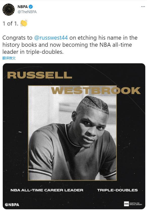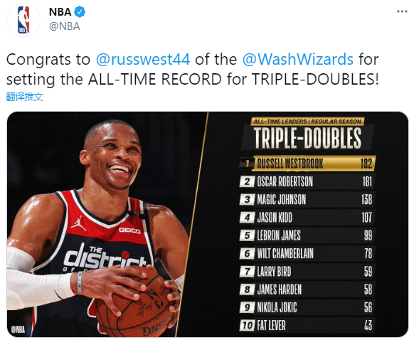 NBA官方以及球员工会官方也第一时间恭喜韦少,恭喜韦少把自己的名字刻在历史纪录榜单上,而且成为历史三双第一人。