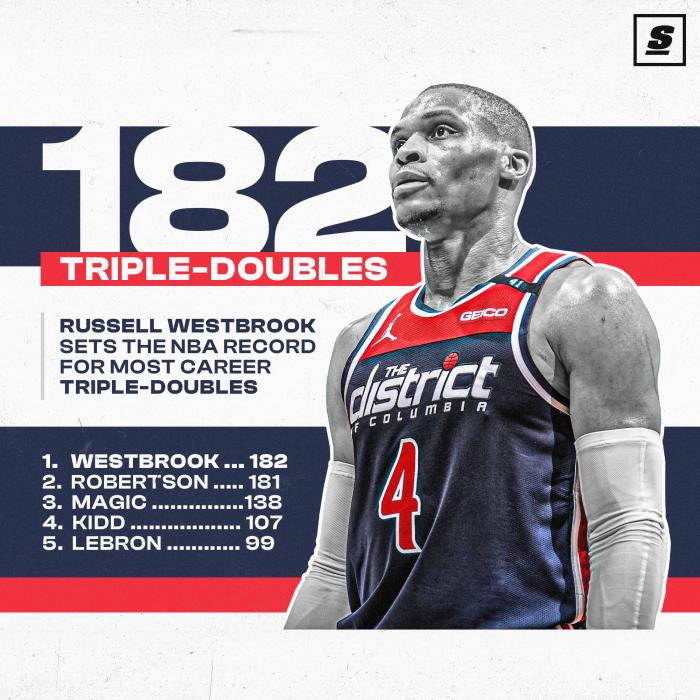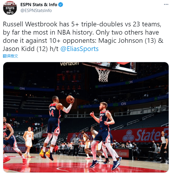 韦少超越大O加冕历史三双第一人,与此同时,这也是韦少对阵老鹰拿到的第5次三双,从而创造面对23支球队都至少5次三双的历史第一神迹,史上仅有魔术师和基德分别面对13队和12队达成这样的神迹。