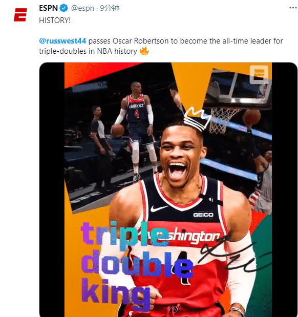众美媒也疯狂晒照以及晒视频,祝贺韦少加冕历史三双王,ESPN发推写道:创造历史。