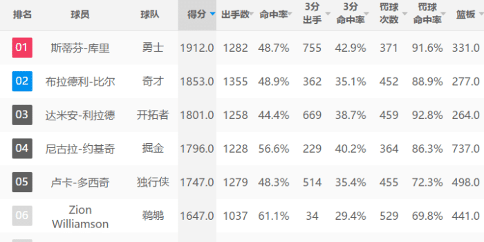 来源:直播车05-11 09:48直播车讯 NBA常规赛行将结束,单项数据王只剩下得分王还有悬念,抢断王属于巴特勒、盖帽王特纳、篮板王卡佩拉,得分王竞争者是比尔和库里,不过目前的情况出现了微妙的变化,比尔受伤了,而库里保持健康,同时他们所在的球队都只剩下4场比赛。比尔目前出战59场,总分1853分,场均得到31.4067分;库里目前出战60场,总分1912分,场均31.8666分。