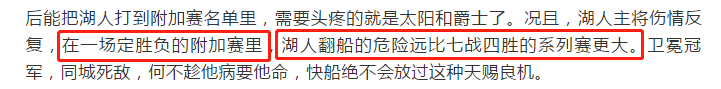 不过,国内篮球名嘴杨毅的官方社媒,却对湖人的前景不是很看好,认为湖人在附加赛中翻船的几率要远超7胜4负的系列赛。“湖人主将伤情反复,在一场定胜负的附加赛里,湖人翻船的危险远比7战4胜的系列赛更大”。