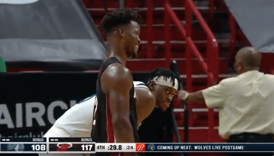 末节最后时刻,阿德巴约执行罚球时,巴特勒和唐斯两个人起争执,两人互喷吵架,刚好裁判就站在一旁,对此裁判第一时间介入,并且吹罚两人技术犯规;昔日队友再见面真是分外眼红,据美媒NBA Central报道,巴特勒当时怒骂唐斯:你软得像小宝宝拉的屎。
