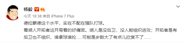 国内名嘴杨毅则是直言:德拉蒙德这个水平,实在不配在强队打球。看湖人开拓者这开局看的好痛苦。湖人是没后卫,没人能组织进攻;开拓者是有后卫也不组织,谁拿球谁抡.....可能是岁数大了有点儿欣赏不了。