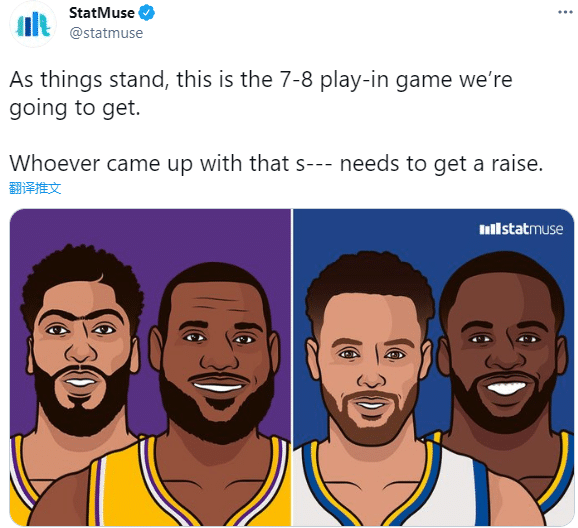 美媒Clutch Points晒出詹姆斯、浓眉等人对决库里等人的恶搞照,发推写道:湖人西部第七,所有的湖人球迷尴尬了。