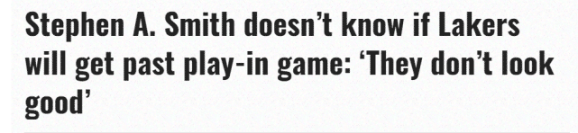 名嘴斯蒂芬-A-史密斯并不看好本赛季湖人的卫冕前景。在最新一期的节目上,他说道:“我替湖人队担心。我甚至不知道他们能否可以赢下附加赛,他们看上去不妙(说了三遍)。”